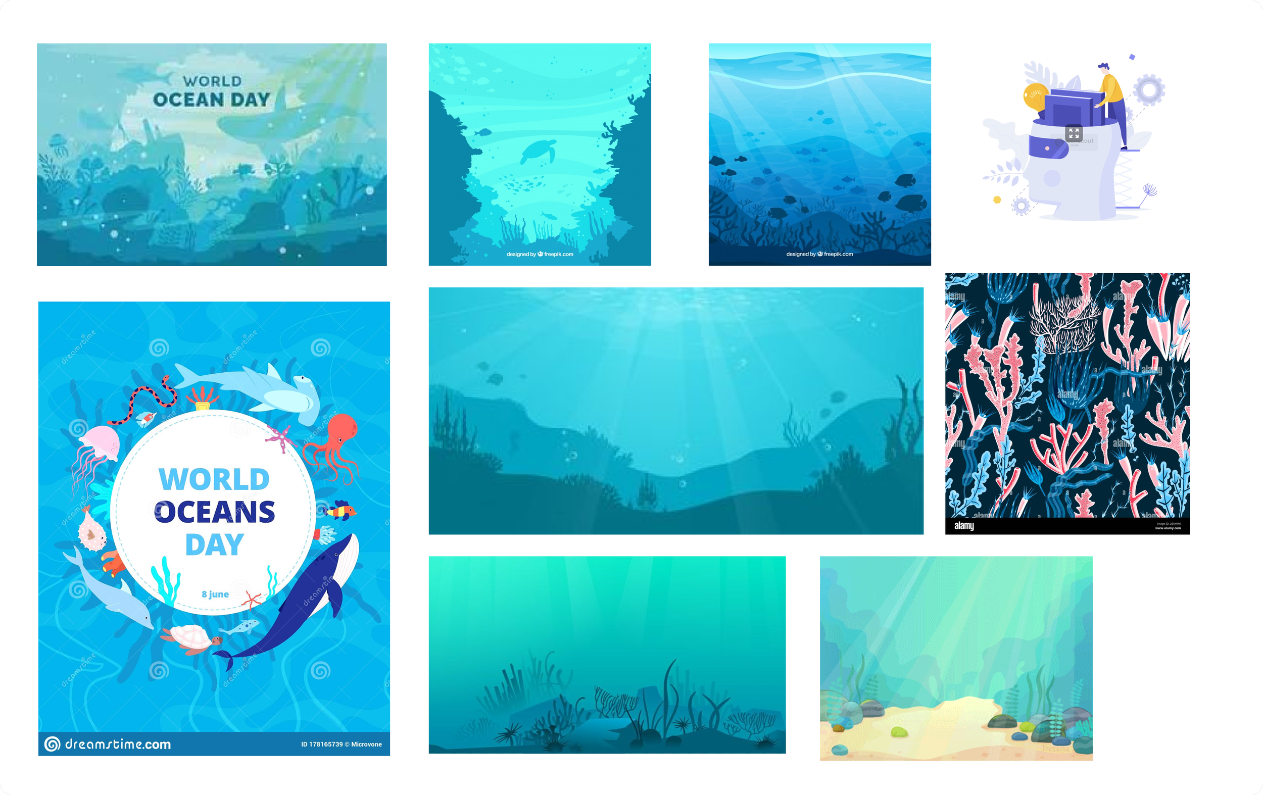Once I understood Sahra’s vision for Erlang Sea’s personality, and the crucial metaphor about fish swarming together, I created a moodboard of illustrations to make sure we were on the same page. I focused on bold oceanic shades of blue and organic shapes. The illustration on the top right of the board brings in the idea of “complexity.”