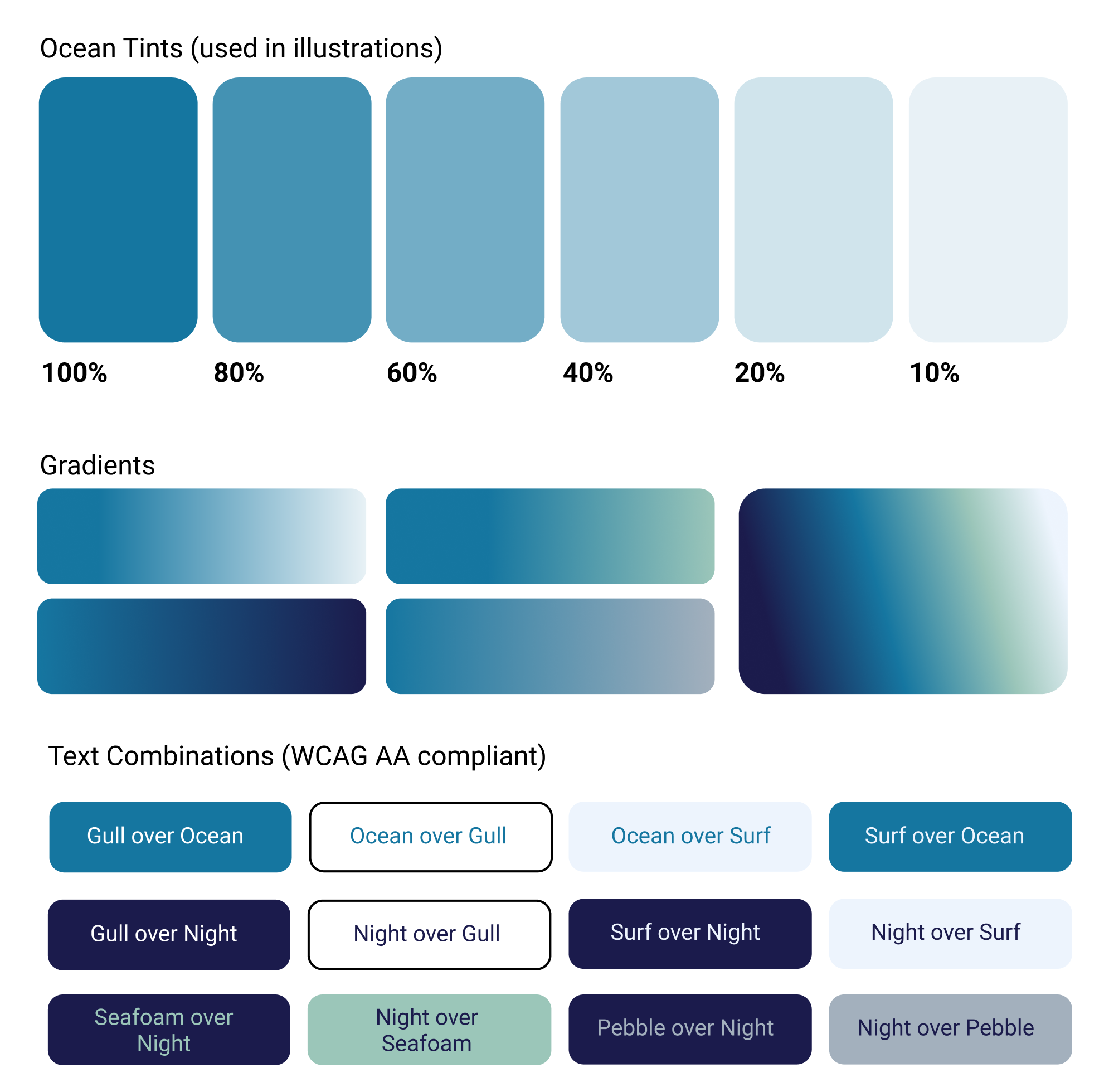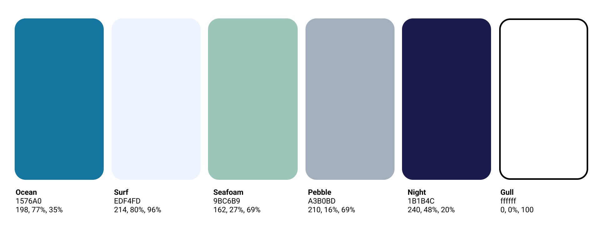 The “Sea Glass” palette reflects Erlang Sea’s ocean theme. The cool colors create the effect of translucent sea glass or ripples across water. There are enough contrasting options to make words clear and accessible, but also enough analogous colors to create subtle side-by-side transitions. When paired with ocean images these colors are peaceful and approachable, but also serious enough to be trustworthy.